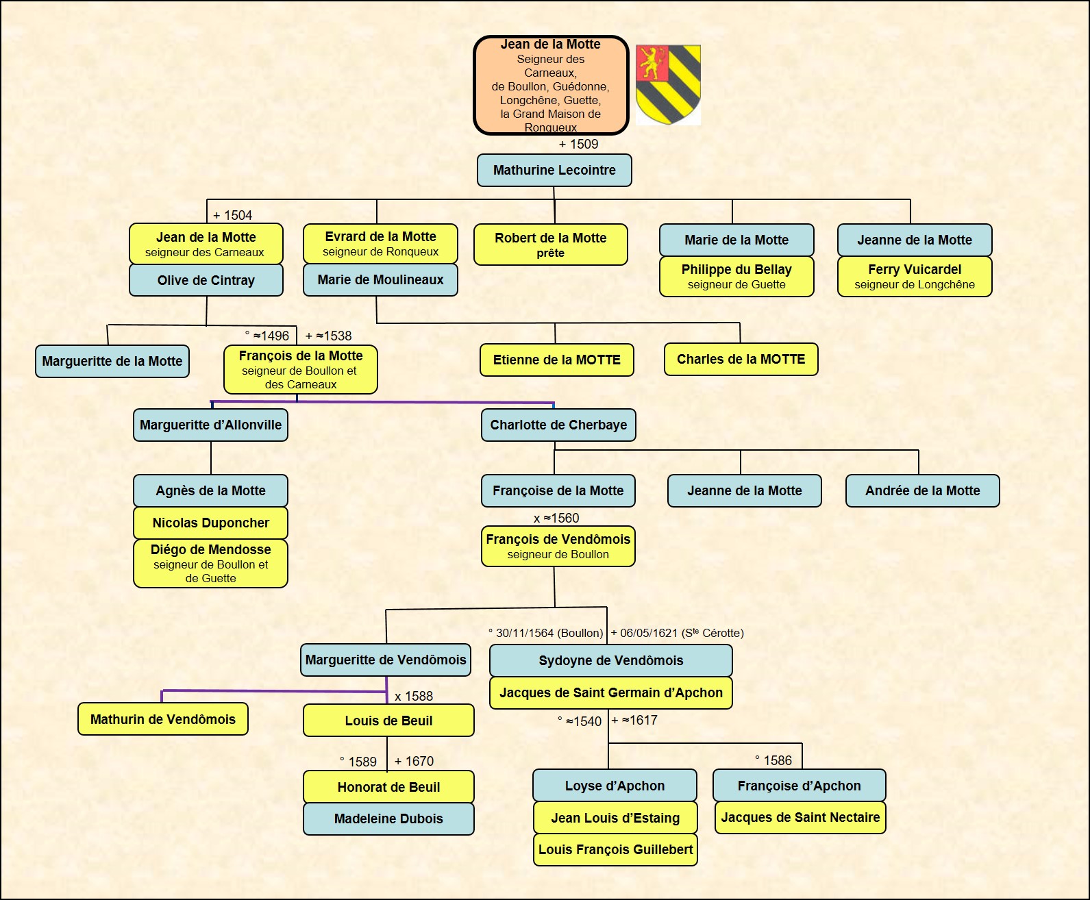 François de VENDOMOIS épouse Françoise DE LA MOTTE (petite fille de Jean de la MOTTE) et devient seigneur de BOULON |